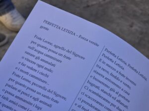 Il gesto proposto è stato particolarmente significativo. Ognuno ha scritto, con la mano che non usa di solito, il nome di qualcuno che conoscono e che ogni giorno fa fatica, oppure qualcosa che loro stessi trovano difficile vivere. «Non importa se la scritta viene storta – ha spiegato una catechista – anzi, proprio perché viene storta state capendo qualcosa». Un modo concreto per immedesimarsi in chi ogni giorno vive la fatica, spesso senza essere visto. L’invito è stato ad accorgersene e a fermarsi, come ha fatto il santo di Assisi.