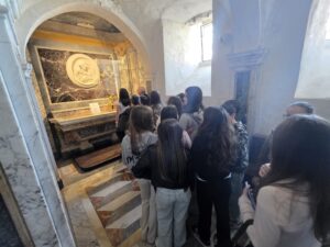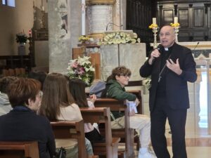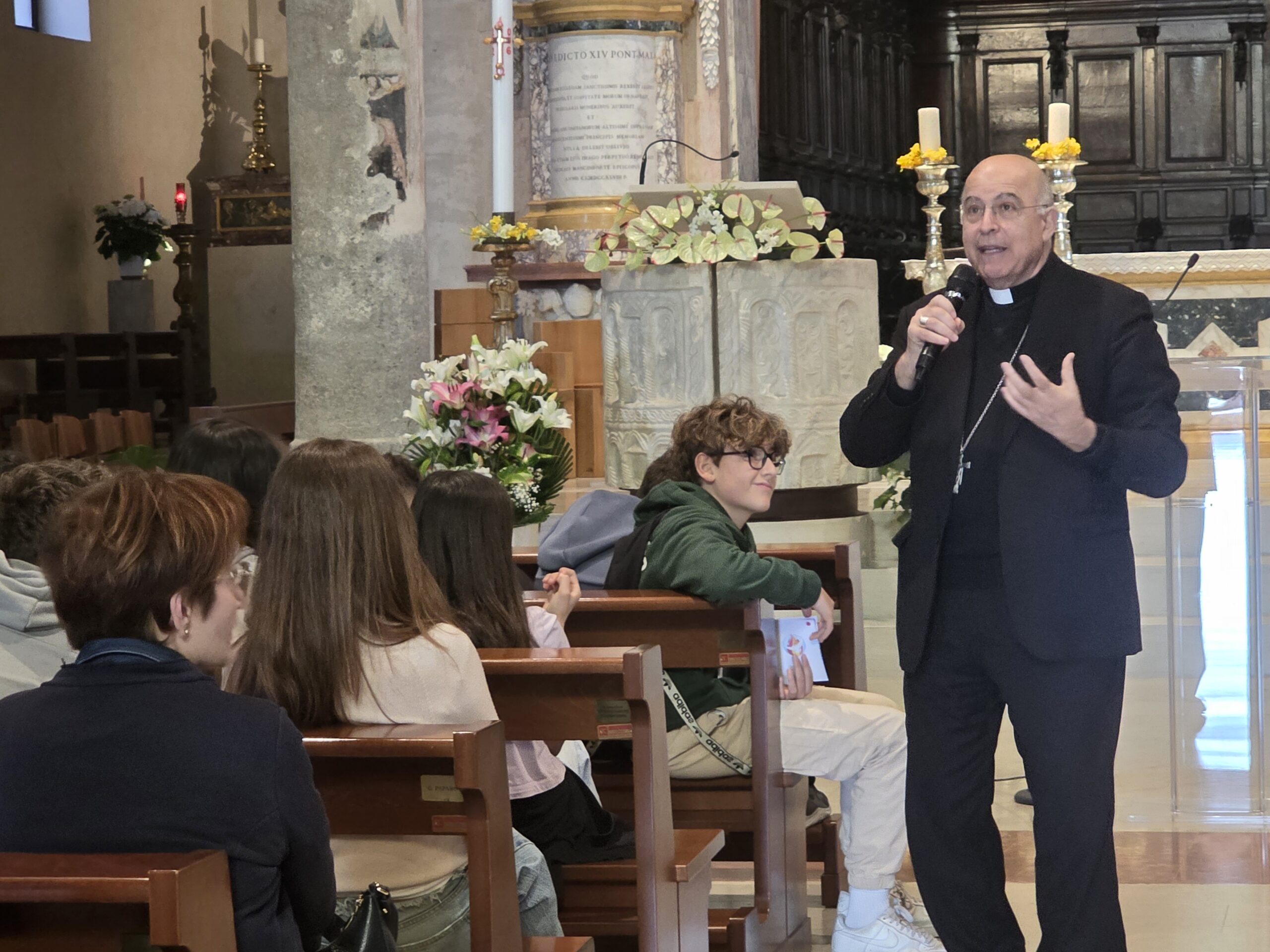 L’Arcivescovo ha poi ricordato che quest’anno ricorrono 1700 anni dal ritrovamento della croce di Cristo a Gerusalemme, avvenuto nel 326 grazie anche al contributo di San Ciriaco. Un frammento della croce è custodito nella stauroteca nella cripta dei Santi Patroni. Proprio lì si è svolto l’ultimo gesto. I ragazzi sono scesi nella cripta e si sono fermati in silenzio davanti alla reliquia. Ciascuno è stato invitato a rispondere all’amore di Dio con una preghiera personale: «Gesù ti voglio bene perché mi hai salvato, mi fai crescere bene con il tuo Vangelo e mi educhi alla pace». Poi l’invito ad allargare lo sguardo: pregare per la pace in un mondo segnato dalle guerre e affidare al Signore la propria famiglia, gli amici e tutte le persone che portano nel cuore.