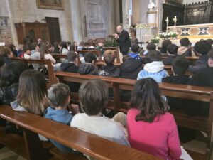 La terza tappa ha messo al centro la testimonianza di pace di San Francesco, attraverso il racconto dell’incontro con il Sultano al-Malik al-Kamil durante le crociate. Francesco si presenta disarmato, come uomo di pace, e sceglie il dialogo invece dello scontro. Un episodio lontano nel tempo, ma straordinariamente attuale. I ragazzi hanno pensato al mondo di oggi, segnato da tanti conflitti, e sono stati invitati ad essere costruttori di pace nella vita quotidiana: nelle relazioni, a scuola, in famiglia. Non grandi gesti eroici, ma scelte concrete e quotidiane.