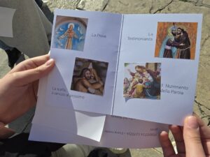 Fin dall’inizio ai giovani è stato consegnato un cartoncino, una sorta di “passaporto” simbolico: ad ogni tappa del percorso è stato aggiunto un adesivo, segno di un cammino che non è solo da compiere, ma da vivere.